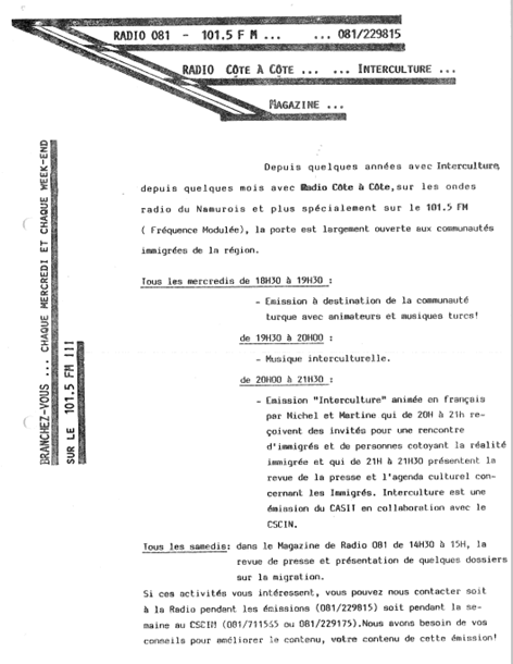 Face au constat que les associations de personnes d’origine immigrée manquent de lieux et de moyens d’expression de leur culture, le Centre socioculturel des immigrés (CSCIN) s’implique dans un projet de radio interculturelle. L’initiative débute avec l’émission Interculture sur la radio locale 081, puis se poursuit en 1985, avec la diffusion de « Radio Côte à Côte » sur les ondes de Namur Centre. Ouverte aux communautés immigrées de la région namuroise, celle-ci propose, à plusieurs moments de la semaine, différents contenus : agenda culturel, musique interculturelle, revue de presse, rencontres d’immigrés, etc. Elles visent à offrir, tant aux Belges qu’aux personnes d’origine immigrée, l’opportunité de mieux connaître la culture et les réalités des différentes communautés étrangères.