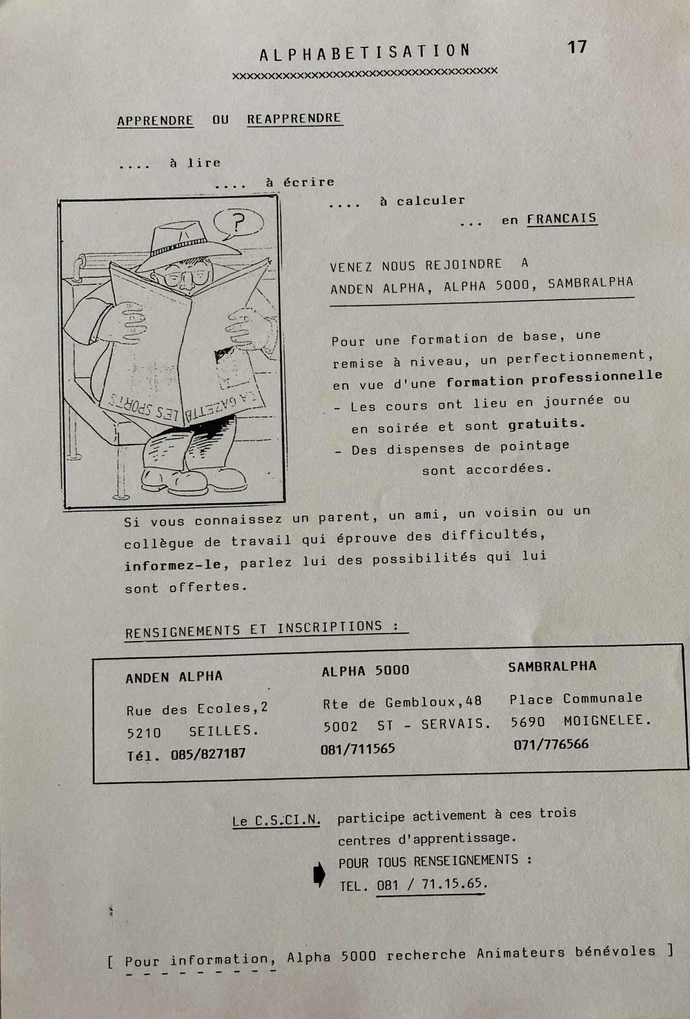 Outre sa participation à la coordination « Alpha » de la province de Namur et sa collaboration active à la campagne de sensibilisation à l’alphabétisation dans diverses villes de la province, le Centre socio-culturel des immigrés de la province de Namur (CSCIN) anime et programme des cours de français et d’alphabétisation.