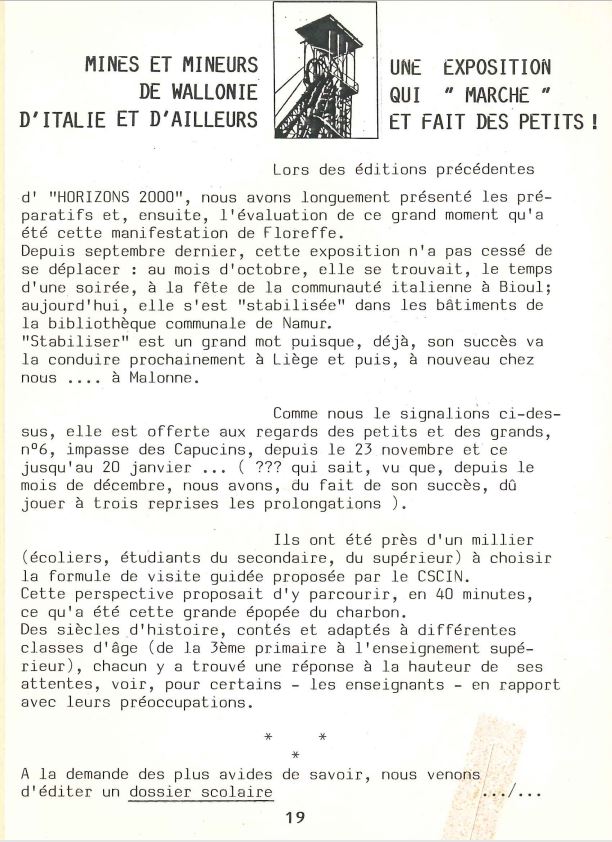 Le Centre collabore à l’exposition Mines et mineurs de Wallonie, d’Italie et d’ailleurs qui se penche sur l’histoire des mines de charbon dans la province de Namur, en s’intéressant plus particulièrement à la main-d’œuvre belge et étrangère qui y œuvrait. L’exposition se prolonge par la publication d’un ouvrage éponyme qui valorise les recherches menées. Cette première publication de type historique lui permet de mettre en lumière la mémoire de travailleurs d’origine étrangère.