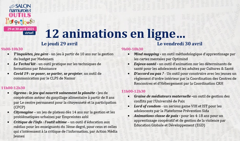 Pour des raisons qu’il n’est plus nécessaire d’expliquer, cette édition sera 100 % virtuelle. Comme tous les deux ans, ce salon met un point d’attention sur les créations pédagogiques qui favorisent la connaissance et l’expression des populations précarisées. Néanmoins, il a également pour vocation de valoriser et de diffuser des outils pédagogiques plus larges auprès du monde associatif et de permettre aux travailleurs issus de secteurs différents de pouvoir se rencontrer et échanger. Animateurs, enseignants, travailleurs ou intervenants sociaux, éducateurs, formateurs et autres professionnels pourront ainsi trouver des outils pour sensibiliser, former, informer ou conscientiser leur public autour de thèmes liés notamment, à l’éducation, l’interculturalité, la santé, le développement durable, l’environnement, les interdépendances Nord-Sud. Ils auront même la possibilité de les expérimenter à travers des animations prévues à cet effet.